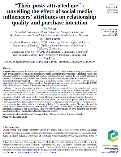 经济学院王博副教授以第一作者身份在国际权威期刊《Journal of Research in Interactive Marketing》(SSCI一区,影响因子11.6)在线发表题为《“Their posts attracted me!”: Unveiling the effect of social media influencers’attributes on relationship quality and purchase intention》的研究论文。马来西亚思特雅大学Cham Tat Huei教授、澳大利亚科廷大学(新加坡校区)Ian Phau教授为共同作者。西华大学为该论文的第一署名单位。