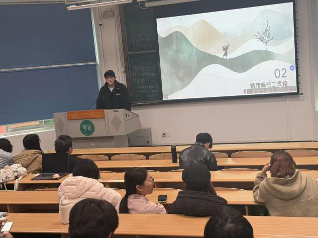 同日,经济学2班在4a-302教室举办了“心灵奇旅,与爱同行”心理健康主题活动。组织者兼主讲人叶诗韵系统介绍了心理健康的重要性,并通过播放结合案例与理论的视频,深入解析大学生常见压力来源,系统讲解正念减压、认知重构、情绪ABC理论等实用心理技巧。在互动问答环节,同学们就学业焦虑、人际关系等问题踊跃交流,现场氛围活跃。叶诗韵总结指出,此次活动不仅是知识的学习,更是心灵的滋养,希望同学们学会关爱自我,积极寻求支持。