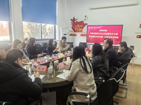 为深化产教融合、推动校企协同育人,12月25日,经济学院与华泰证券四川分公司成都交子大道营业部在1教4010会议室召开“党建引领 实践育人 协同发展”主题校企合作交流会。华泰证券四川分公司成都交子大道营业部总经理尚光、营业部办公室主任张琳,营业部经理谢红、刘子恒,经济学院党委书记胡雪峰、院长程盈莹、党委副书记易宇峰、副院长成欢出席会议以及经济学院师生代表共聚一堂,共商校企合作新路径。会议由经济学院金融投资系主任王蕊主持。