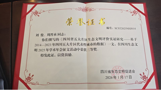 我院刘俊老师及研究生周晋承、谢珂、周晓丽受邀出席年会,其中刘俊老师和研究生周晋承完成的论文《四川省五大片区生态文明评价实证研究——基于2014—2023年四川五区五大代表性城市的数据》在学术年会征文活动中被评为三等奖。作为四川省生态文明促进会理事,刘俊老师长期关注四川生态文明建设和发展,这是刘俊老师团队第二次在四川生态文明学术年会征文中获奖。